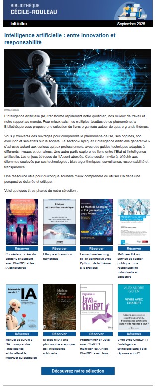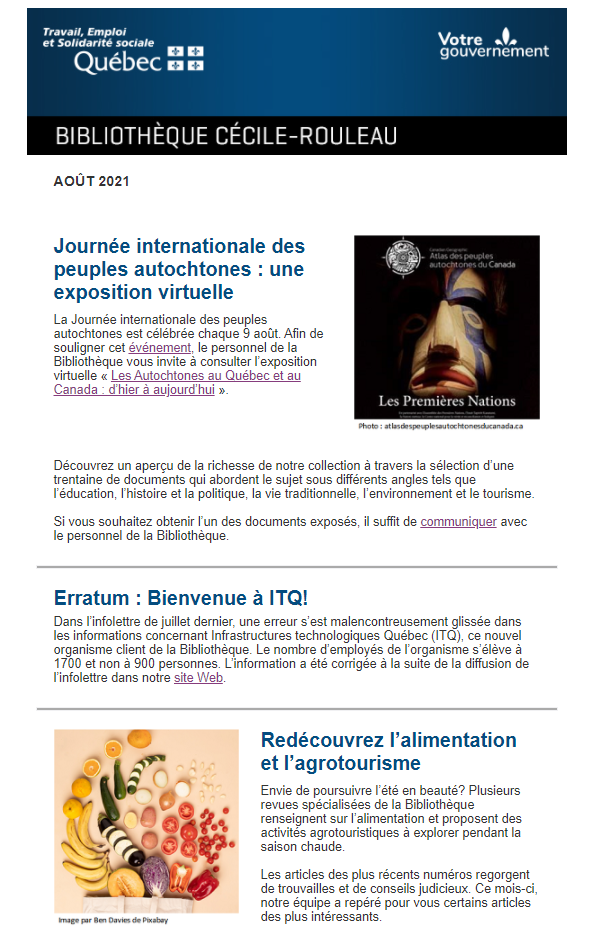 L’Équipe de la Bibliothèque vous invite à consulter l’infolettre du mois de septembre 2025 sur notre site. Vous y trouverez notre plus récente liste de nouveautés ainsi que d’autres informations d’intérêt pour la clientèle.
